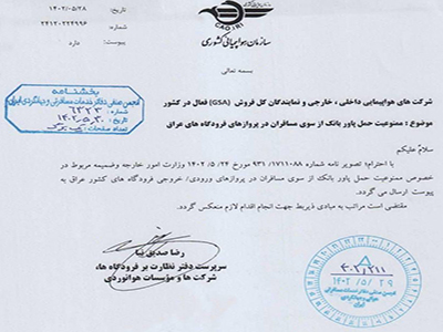 سازمان هواپیمایی کشوری اعلام کرد بر اساس ابلاغیه وزارت امور خارجه، حمل پاور بانک در بار یا همراه مسافران در پروازهای فرودگاههای عراق ممنوع است.